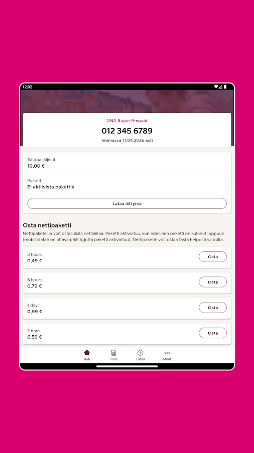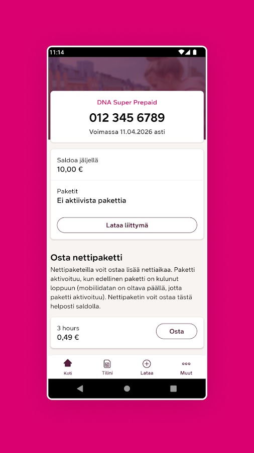 Приложение помогает, например, управлять расходами. Вы можете приобрести недорогие пакеты данных вместо ежедневной платы за интернет. Использование приложения бесплатно для предоплаченной подписки DNA.