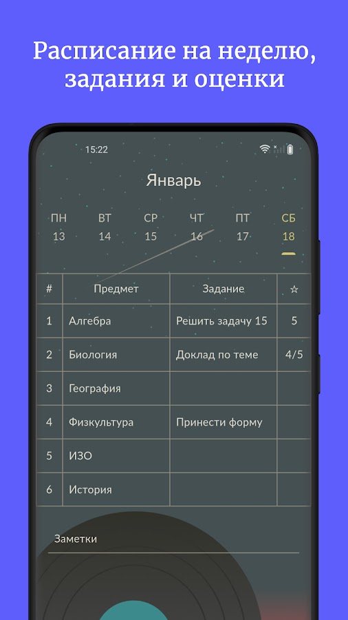 Приложение помогает школьникам следить за расписанием уроков, домашними заданиями и оценками. Организуй свою учебу с легкостью!