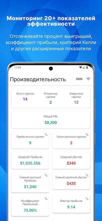 • Отслеживать показатели производительности, такие как соотношение выигрышей и проигрышей и соотношение риска и прибыли