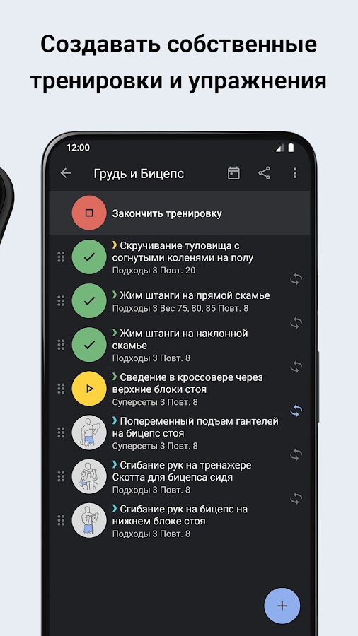 • Настраиваемые планы тренировок: Создавайте и делитесь программами для поднятия тяжестей, упражнений с собственным весом и кардио — поддерживаются суперсеты, круговые тренировки и смешанные программы.