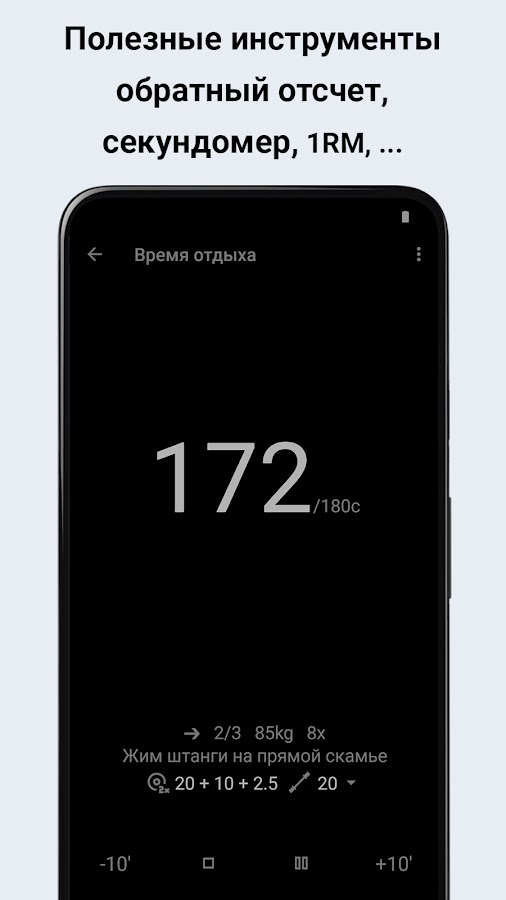 • Глубокий анализ: Анализируйте свой прогресс с помощью подробной статистики, графиков и отчетов (например, 1ПМ, объем тренировки, калории, время отдыха).