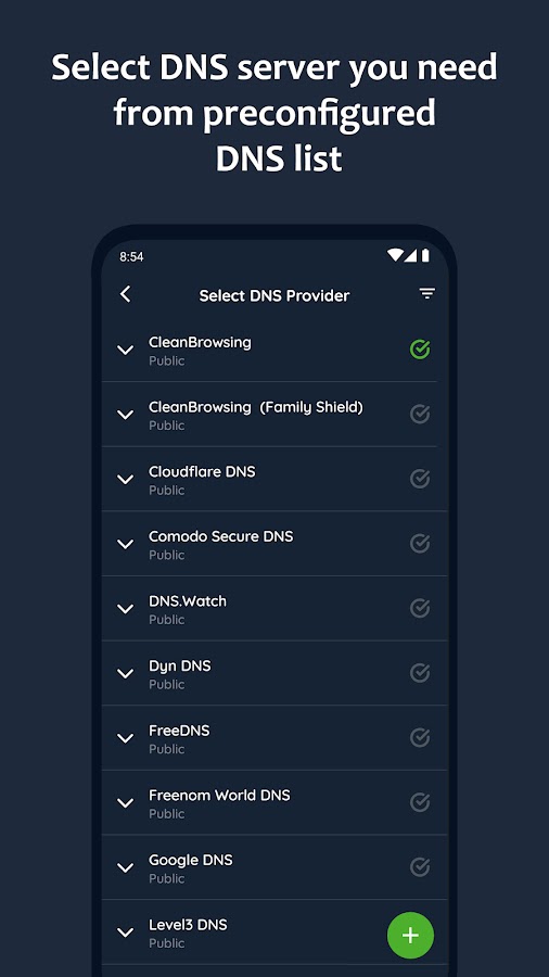 ✔ Выбор из списка предварительно настроенных общедоступных DNS-серверов