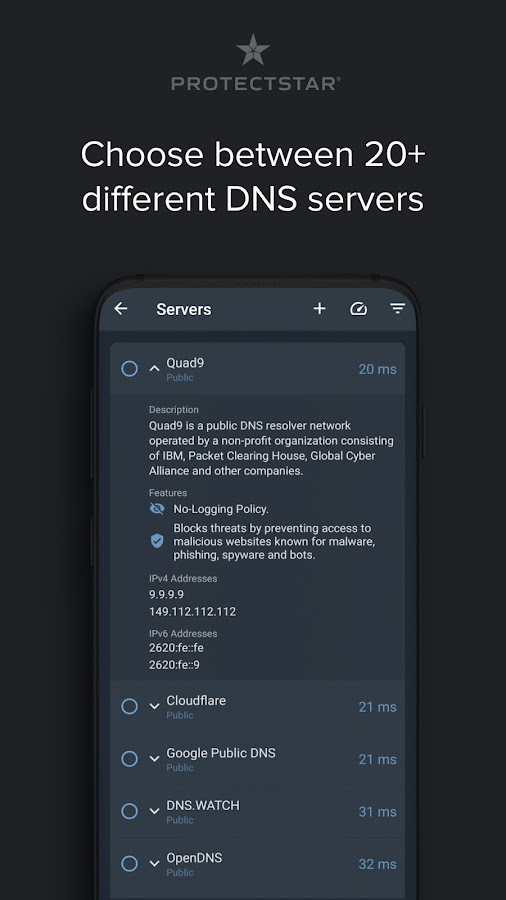 DNS Changer от Protectstar™ — это удобный инструмент для Android, который помогает быстро менять DNS‑сервер (DNS server) на телефоне или планшете. Если вы искали “DNS changer”, “сменить DNS” или “DNS сервер” — вы по адресу. Используйте быстрый DNS в Wi‑Fi и мобильной сети (3G/4G/5G), сократите время DNS lookup, ускорьте открытие сайтов и приложений и помогите стабилизировать задержку в онлайн‑играх. Вы также можете выбрать DNS‑провайдеров, которые способны фильтровать многие домены рекламы, трекинга и вредоносных сайтов на уровне DNS, а для детей включить семейный DNS‑фильтр — без рут‑прав и без сложных настроек роутера.