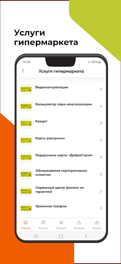 Покупайте удобно, не выходя из дома, пользуйтесь услугами и экономьте с бонусной программой в мобильном приложении гипермаркета ДоброСтрой!
