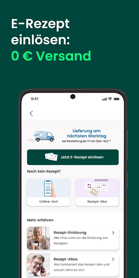 Ваша онлайн-аптека работает круглосуточно. Активируйте свой электронный рецепт в приложении DocMorris до 20:00, и мы доставим его на следующий рабочий день.*** Вы получите свои лекарства – надежно и бесплатно, с доставкой прямо к вам домой!