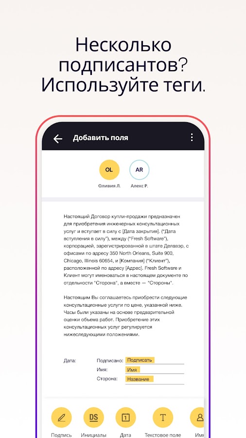 Docusign обеспечивает простое и безопасное электронное подписание документов и получение подписей от других пользователей. Это приложение избавляет от хлопот, затрат и рисков, связанных с печатью, передачей по факсу, сканированием и отправкой документов по экспресс-почте.