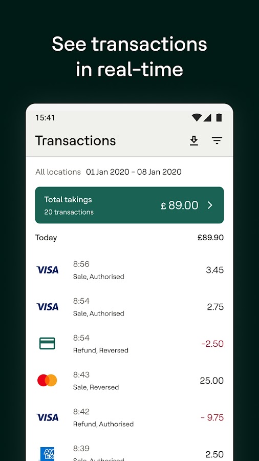 Фильтруйте, экспортируйте и просматривайте дату, время и тип карты для каждой транзакции.