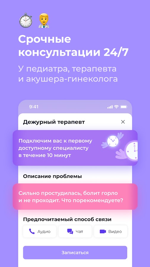 — экстренная консультация в любое время с дежурном врачом: терапевтом, гинекологом или педиатром.