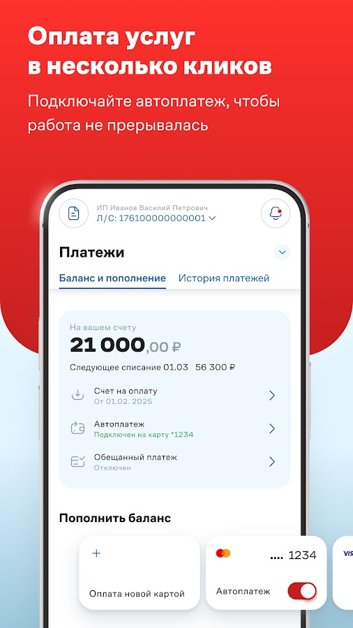 • Пополняйте баланс картой или по счету, подключайте авто- и обещанный платеж, чтобы работа не прерывалась.
