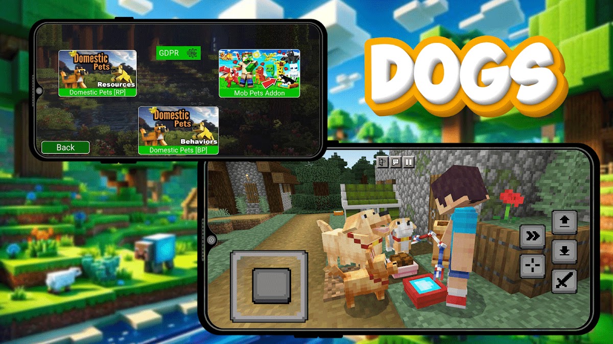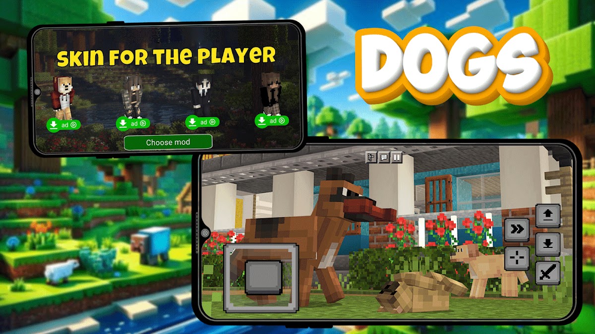 Dogs Mod для Minecraft Pocket Edition — Это самый милый и полезный мод, который только есть в пиксельном мире, с этим аддоном в вашем мире появятся разнообразные питомцы разных видов, новые предметы и крутые улучшения, также у нас большой выбор крутых стилизованных скинов для MCPE