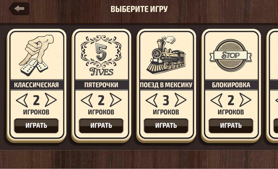 — десять разновидностей игры в домино (классическое домино, козел, простой крест, осел, морской козел, ЧЧВ, маггинс, мексиканский поезд, берген), еще четыре разновидности (матадор, генерал, пятерочки, колбаса) на подходе