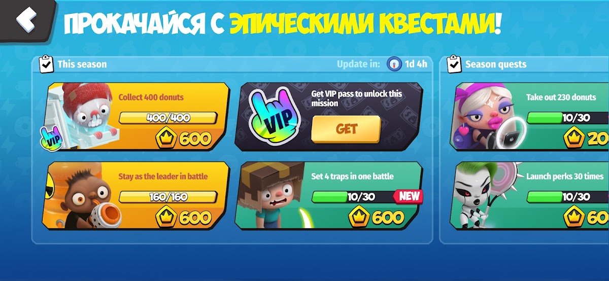 💡Загляни в Donut Pass. Упорство в битвах принесёт тебе особые плюшки. Заходи в Donut Pass чаще и не забудь получить все награды сезона.