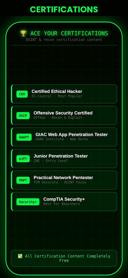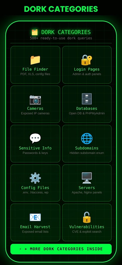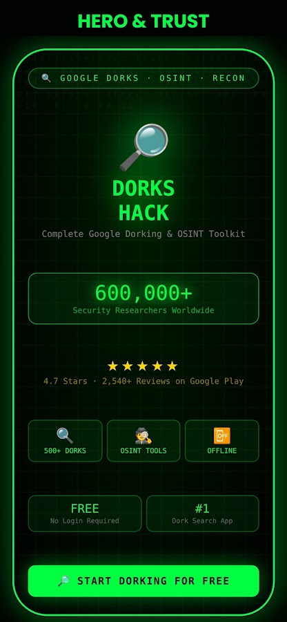 Dorks — Hack — это самое полное бесплатное приложение для освоения Google Dorking с нуля. Независимо от того, являетесь ли вы новичком или опытным пентестером, работающим с платформами, предлагающими поиск уязвимостей, это приложение охватывает команды Google Dork, инструменты OSINT, сканирование уязвимостей и тенденции кибербезопасности 2026 года на вашем родном языке, в любое время и в любом месте.