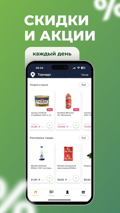Сервис «Торнадо» — приложение, которое вмещает в себя полный спектр услуг: доставка, самовывоз и «Сканируй-Покупай». Выбирай удобную функцию в приложении и действуй!