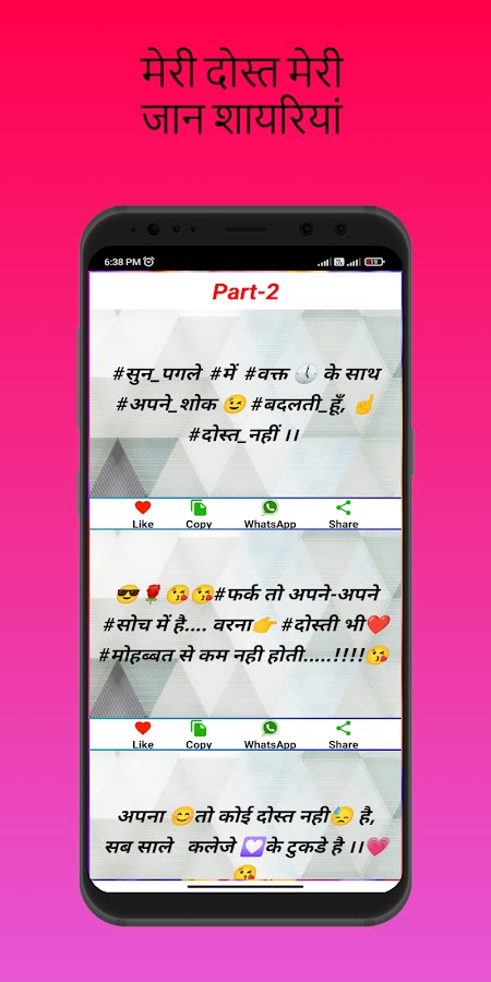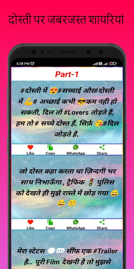 Dosti Shayari В приложении на хинди очень простой в использовании интерфейс, просто прокручивайте вверх и вниз, чтобы прочитать хинди Dosti Shayari, и легко установите его в качестве статуса WhatsApp или статуса FB. Это приложение дает вам грустный статус Whatsapp на хинди без подключения к Интернету.