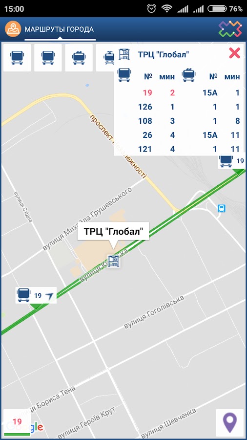 — показывать на карте полный перечень городских маршрутов транспорта, как коммунальных троллейбусов, так и частных автобусов