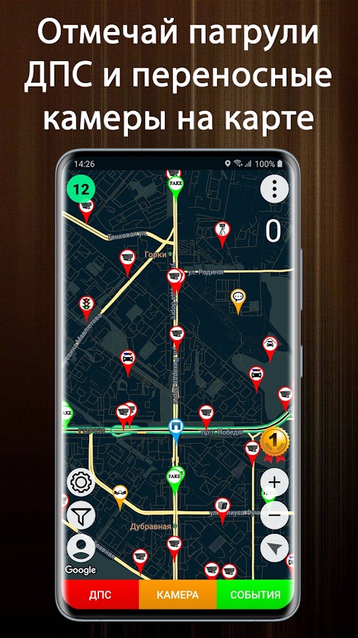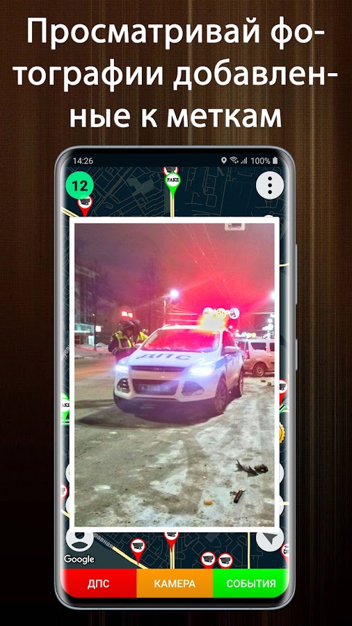 Так же вы cможете отмечать на карте местоположение переносных камер и постов ДПС, а так же видеть их расположение отмеченное другими пользователями приложения.