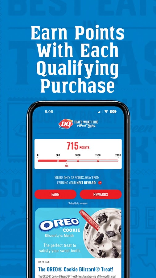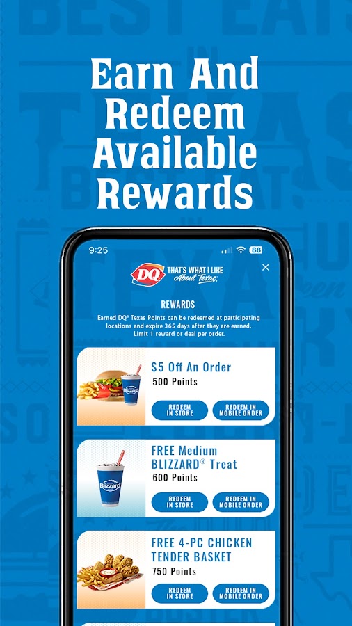 Зарабатывайте 10 баллов за каждый потраченный доллар при заказе через приложение, онлайн или в участвующих заведениях DQ® Texas. Обменивайте свои баллы на вкусные награды.