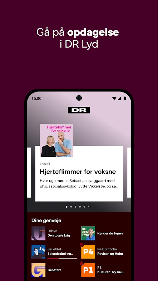 DR LYD будет развиваться и станет более личным приложением. Новый интересный контент публикуется постоянно, и у DR есть небольшая редакционная команда, которая представляет новинки на первой полосе, а также вдохновляет и находит путь к большому каталогу датского контента.
