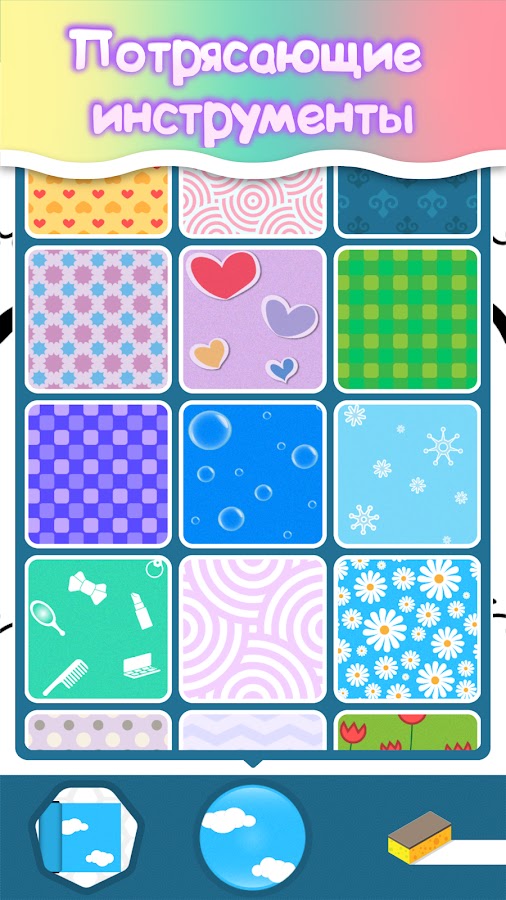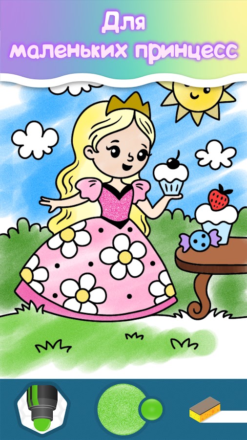 Помимо того что в игре вы найдете множество раскрасок милых принцесс и единорогов с русалками и котятами, в вашем распоряжении также будут потрясающие инструменты для раскрашивания такие как кисть, фломастер, карандаш, рисование узорами, с блеском и заливка контура.