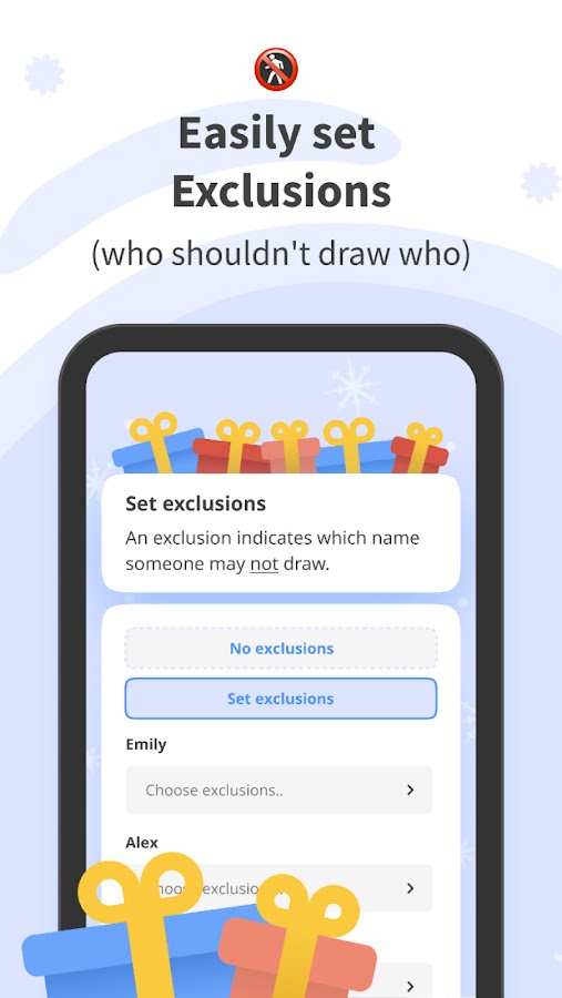 Настройте обмен подарками в 3 простых шага: создайте группу, установите исключения и выберите имена для розыгрыша. Это быстро, просто и идеально подходит для групп любого размера.