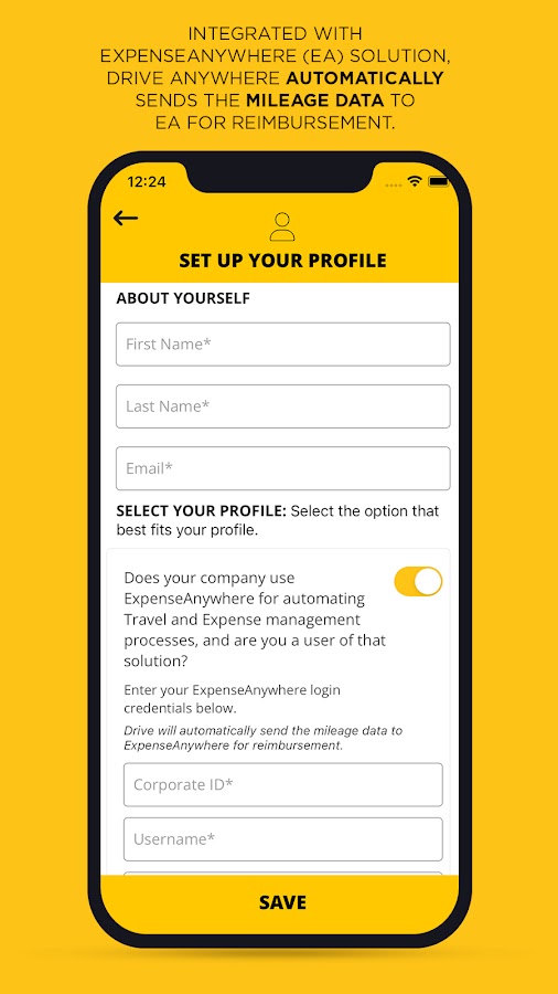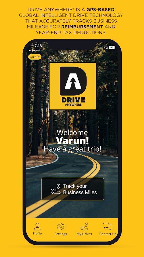 DRIVE Anywhere® — это технология интеллектуального вождения на основе GPS, которая точно отслеживает деловые поездки в любой точке мира и рассчитывает компенсацию за пробег на основе ставок возмещения за пробег в конкретной стране. DRIVE Anywhere позволяет пользователям создавать свои профили и настраивать способ использования приложения. Настройки DRIVE Anywhere позволяют пользователям регистрировать свои личные транспортные средства (электрические, бензиновые, гибридные, дизельные) и устанавливать конкретную ставку возмещения расходов на пробег. Пользователи могут ввести столько автомобилей, сколько пожелают. Точно так же приложение позволяет пользователям добавлять свои цели вождения своего автомобиля для бизнеса.