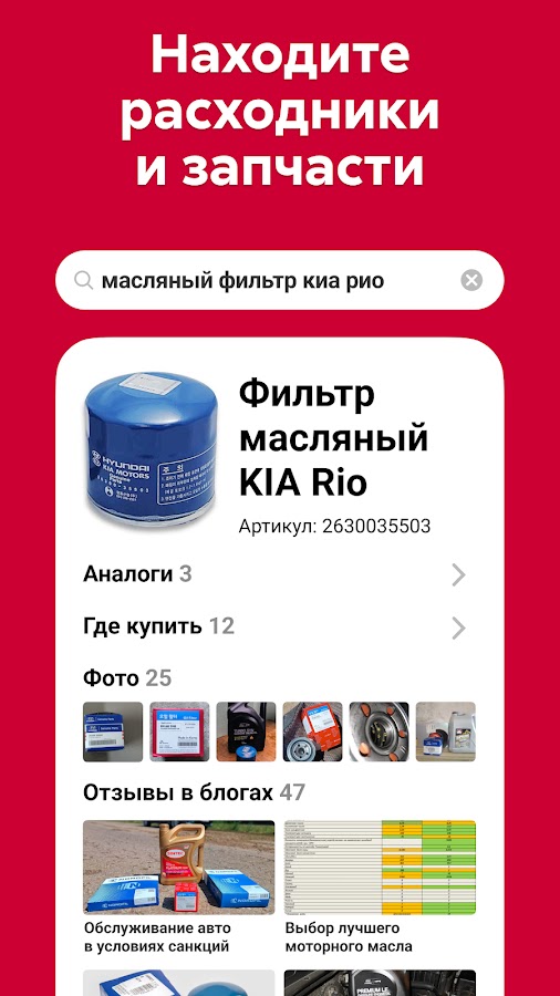 Выбирайте интересующие вас параметры: марку машины, модель, год выпуска — приложение само подберёт подходящие статьи и отзывы. Или воспользуйтесь каталогом авто с фильтрацией.