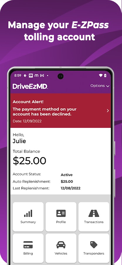 С помощью мобильного приложения DriveEzMD вы можете оплачивать проезд за видео и управлять своей учетной записью Pay-By-Plate или E-ZPass: