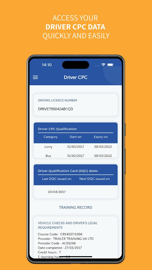 Соблюдение профессиональных требований: CPC: Мы удовлетворяем самые высокие потребности профессиональных транспортных работников. Driver Codes помогает водителям большегрузных автомобилей и другим операторам PCV, предоставляя централизованный доступ к критически важным данным о соответствии требованиям:
