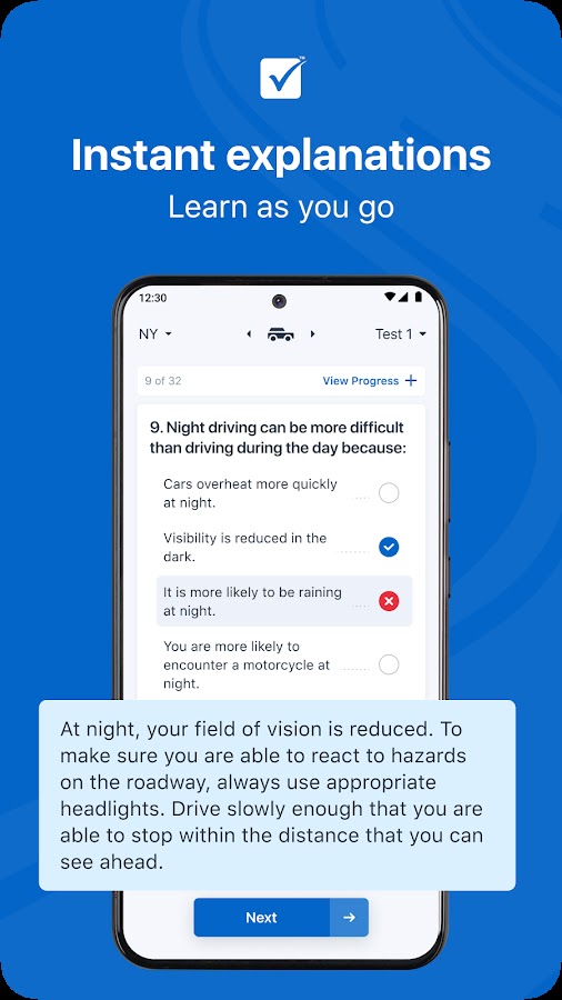 Вопросы для практики организованы по темам и основаны на концепциях, представленных в официальном руководстве для водителей вашего штата, что помогает вам сосредоточиться на самом важном.