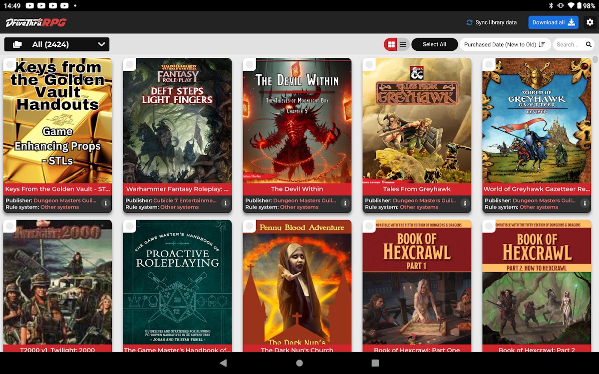 С помощью этого приложения вы можете синхронизировать свою библиотеку DriveThruRPG целиком или выборочно с вашим устройством Android. Это также позволит вам получить доступ к библиотечным материалам с наших дочерних сайтов: DMs Guild, WargameVault, Storytellers Vault, DriveThruComics, DriveThruFiction и других.