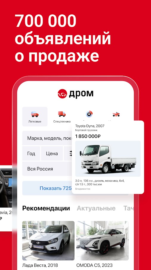 База объявлений Дрома от частных лиц и автосалонов насчитывает более 700 000 предложений со всей России. Машины на любой вкус и цвет, прямо с мобильного.