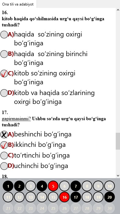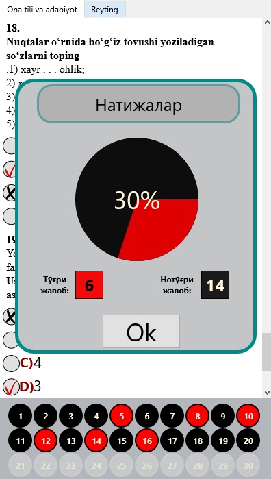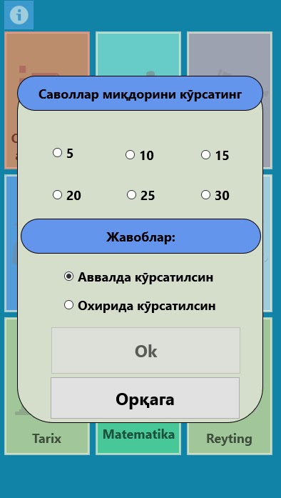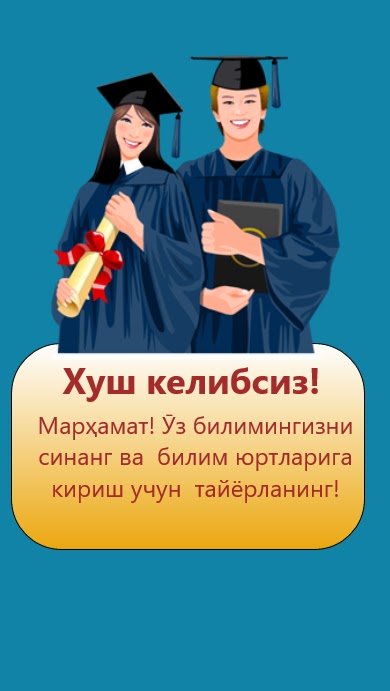 Давлат Тест Маркази (ДТМ) — тест синовлари. Ушбу дастур орқали сиз ӯз билимингизни синанг ва олий ӯқув юртларига кириш учун тайёрланинг. Дастурда барча фанлардан намуналар келтирилган бӯлиб саволлар миқдорини танлаш жавоблар шаклларини кӯрсатиш имкониятлари яратилган. Шунингдек рейтинг системаси ӯрнатилган бӯлиб, сизнинг билимингиз ушбу система орқали кузатиб борилади.Топшириқларни қанчалик яхши жавоб берсангиз рейтинг кӯрсатгичи шунчалик баланд бӯлади. Ишонамизки ушбу дастуримиз азиз мухлисларимизга жуда ҳам мақул келади ва албатта биз дустурга янги янги саволлар қӯшиш ва уни такомиллаштириш ишларини олиб борамиз ва яқин вақтларда дастуримизни янада ҳам фойдали бӯлиши учун ҳаракат қиламиз.