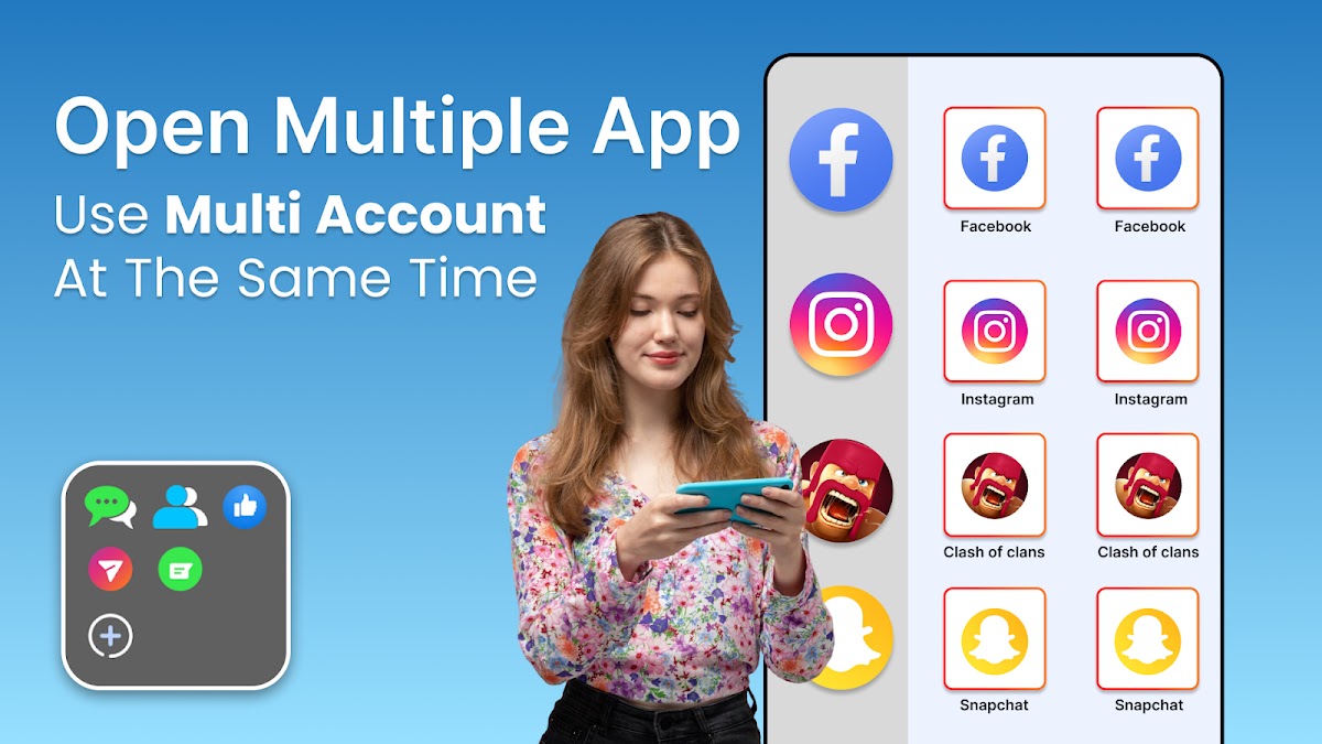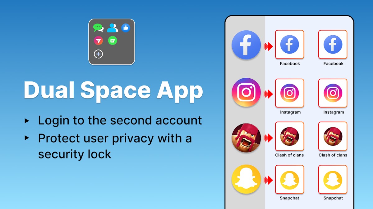 Dual Space pro: Parallel space & Multiple Accounts — лучший клонировщик приложений. сохраните вход в несколько учетных записей, создав дополнительное пространство для хранения на мобильном устройстве. Клон с двойным пространством — это новейшая технология, которая создает дополнительное пространство для хранения двух учетных записей и второго места на вашем мобильном телефоне. Бесплатное приложение с двойным пространством позволяет пользователю одновременно поддерживать и запускать две учетные записи в нескольких учетных записях приложений социальных сетей. Двойное приложение создает индивидуальное пространство для всех клонированных приложений сети социальных сетей и клонирования игр.