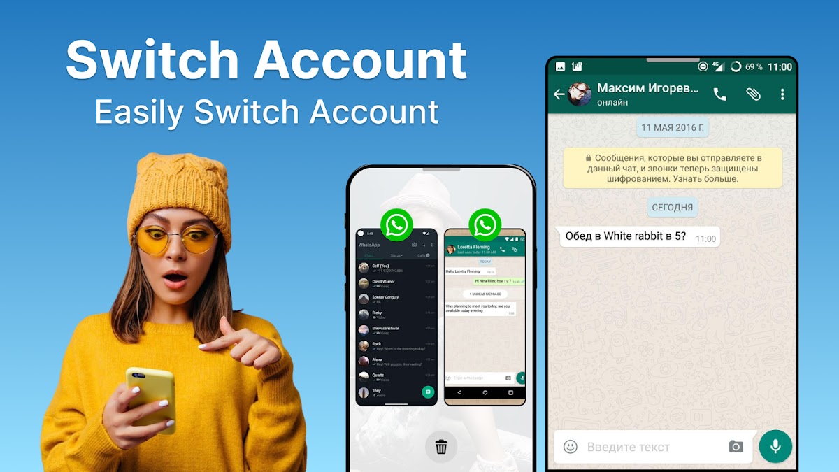 Функция Multi Account позволяет вам использовать 2 WhatsApp на одном телефоне, не покупая второй телефон.