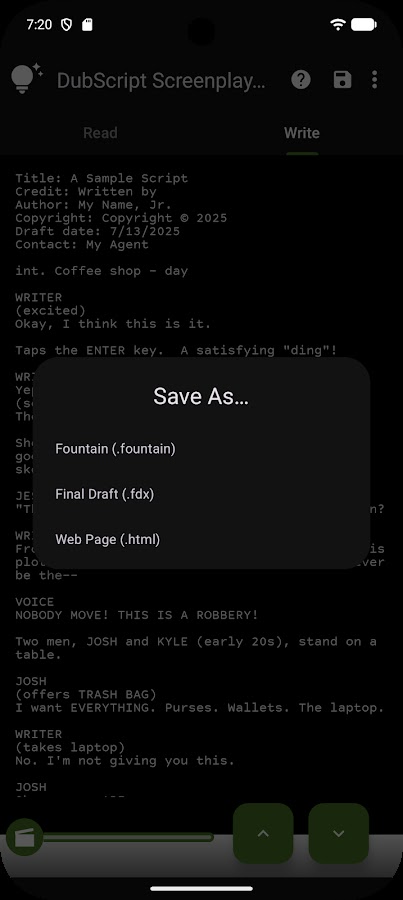 DubScript поддерживает разметку Fountain, популярный открытый стандарт для написания сценариев в виде простого текста. Это означает, что ваш файл сценария полностью совместим с любым старым текстовым редактором. Для обмена с другими приложениями просто скопируйте и вставьте. Или нажмите кнопку Поделиться, чтобы быстро переслать себе (или своему агенту) резервную копию вне устройства по электронной почте или в мессенджере.