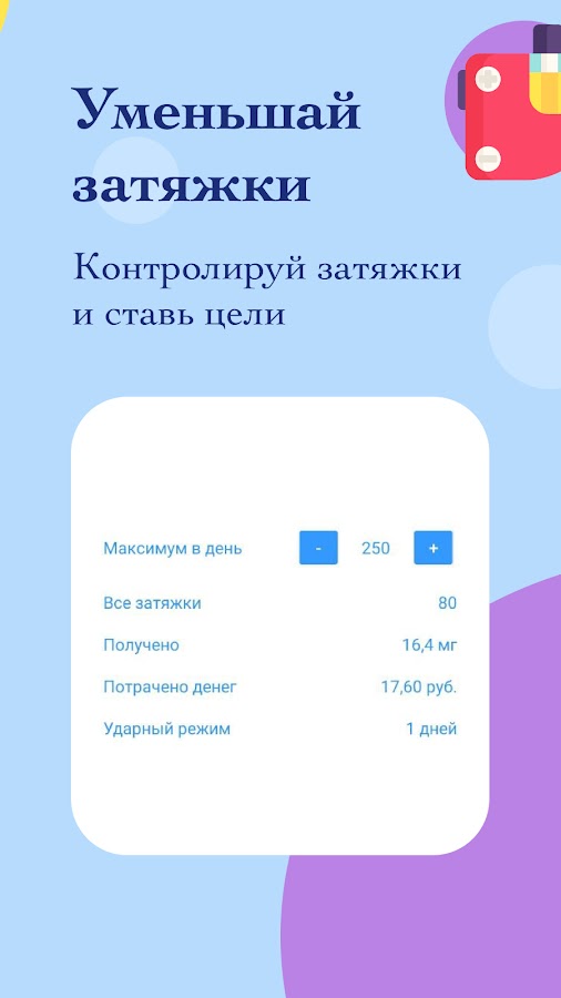 В этом вам поможет «Дудка | Бросить парить вейп» с его обширной статистикой и возможностью устанавливать прогрессивные цели, следить за их выполнением, контролировать ударный режим (режим, в котором вы парите меньше установленного лимита), а также смотреть статистику за выбранный период. Дополнительно вы можете подсчитывать свои финансовые траты на электронки и вейп, а также оценивать суммарное количество потреблённого никотина.