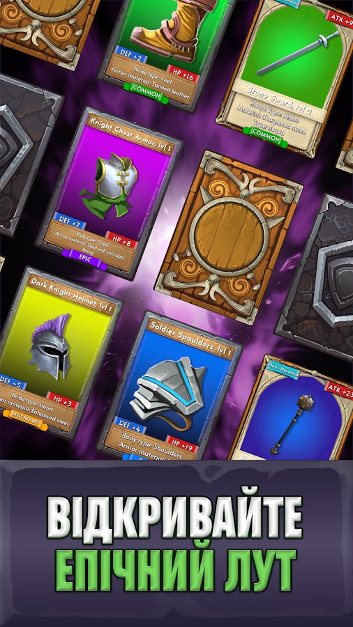 Повзайте по підземеллях, бийтеся з епічними монстрами, збирайте карти, реліквії, рідкісну, епічну або легендарну зброю та обладунки! Збирайте карти та створюйте потужні колоди, просуваючись у пригодах у стилі підземель і драконів 🎮