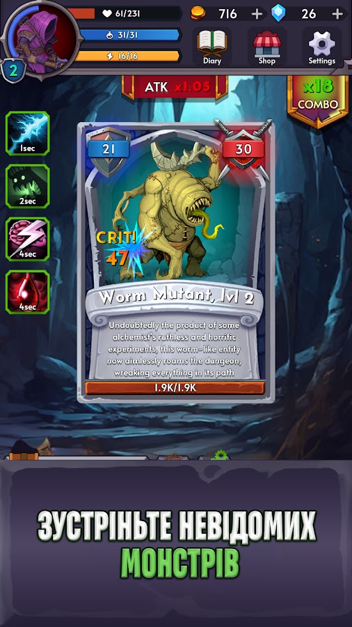 ⚡️Бийтеся картками з вашими ворогами за допомогою унікальної системи клацання та стикайтеся зі все більш страшними монстрами в міру прогресу. Фанат dungeon crawlers не захоче пропустити цю гру в стилі Dungeon and Dragons clicker tap titans style