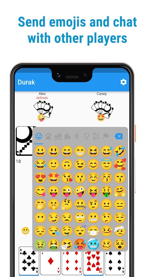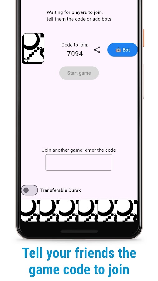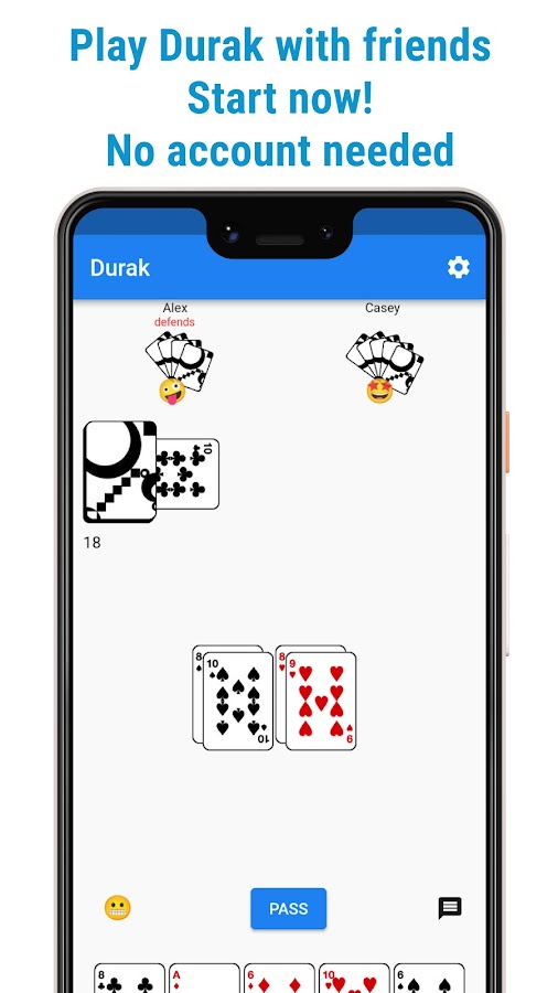 Хочется играть в дурака со знакомым, который не рядом? Играйте без регистрации! Скажите другим игрокам код, по которому они присоединятся к вашей игре. Или поиграйте против бота на своём телефоне: боты неплохо играют, попробуйте победить! Посылайте эмодзи и сообщения друзьям во время игры!