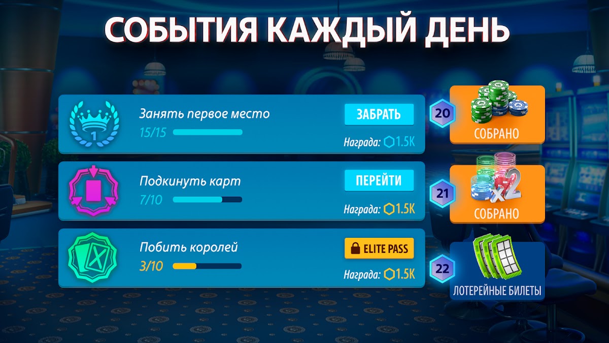 БЕСПЛАТНЫЕ ФИШКИ КАЖДЫЙ ДЕНЬ: Начните свое путешествие в мире Онлайн Дурака с нашими щедрыми ежедневными бонусами. Заходите в игру каждый день, чтобы получать бесплатные фишки и особые награды, которые помогут вам дольше оставаться в игре, не прерываясь ни на что. Чем больше играете в Дурак Онлайн, тем больше бонусов!