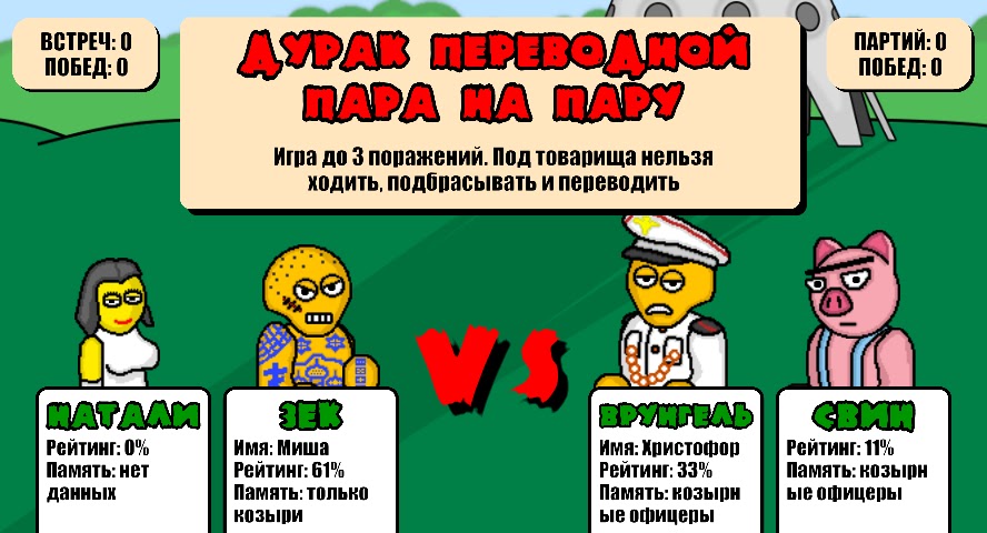 Вам предстоит сразится с более чем 50 персонажами на 15 различных локациях. Сложность и количество соперников будет возрастать по мере продвижения по карте. Игра на последних трех локациях отличается особой сложностью — пройдя их вы можете считать себя настоящим мастером Дурака! Удачи!