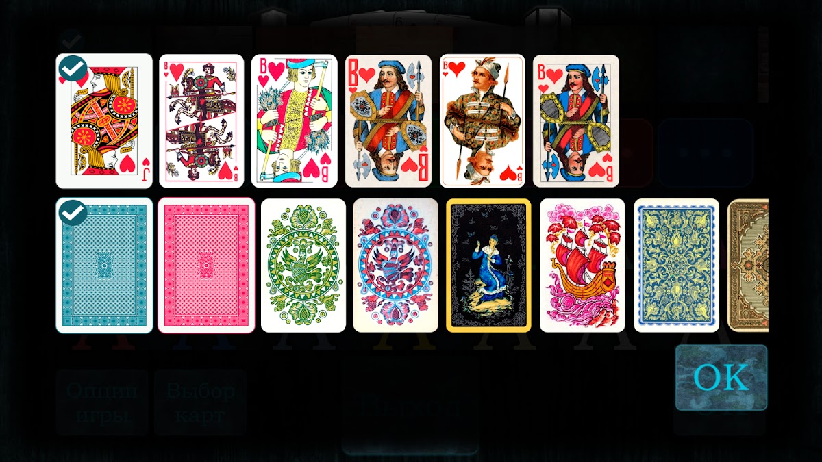Варианты колод карт, «рубашек», а также фонов столов можно смешивать в любой комбинации.