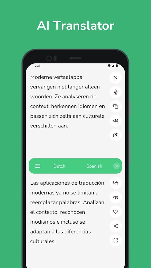 Если вы хотите улучшить свои языковые навыки, общаться с друзьями или исследовать новые направления, наш голландско-испанский и испанско-голландский переводчик станет вашим лучшим языковым компаньоном. Откройте для себя будущее перевода с помощью передовых функций, таких как распознавание текста по фотографиям и обучение искусственному интеллекту в режиме реального времени.