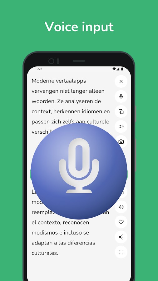 • Распознавание голоса: говорите прямо в приложении, и наш искусственный интеллект мгновенно переведет вашу речь, делая разговор более плавным.