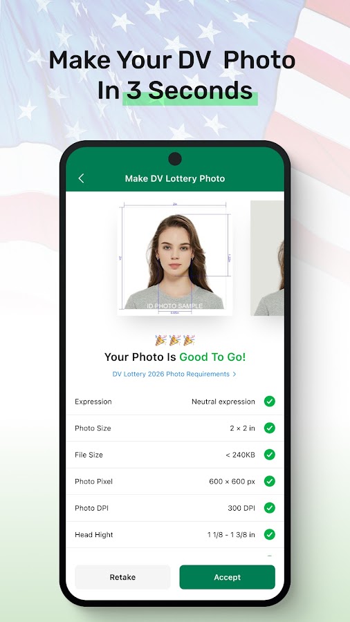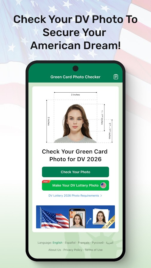 Сделайте подачу фотографий для участия в лотерее DV Lottery максимально простой с помощью Green Card Photo Checker and Maker! Это приложение создано, чтобы помочь вам подготовить идеальную фотографию для лотереи виз США (DV Lottery): создать, проверить и довести до совершенства. Больше не нужно гадать или переживать, соответствует ли ваше фото строгим государственным стандартам – наше приложение гарантирует полное соблюдение всех необходимых требований!