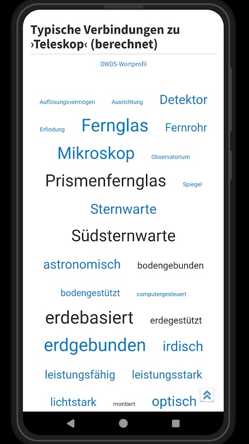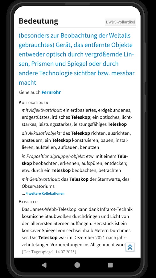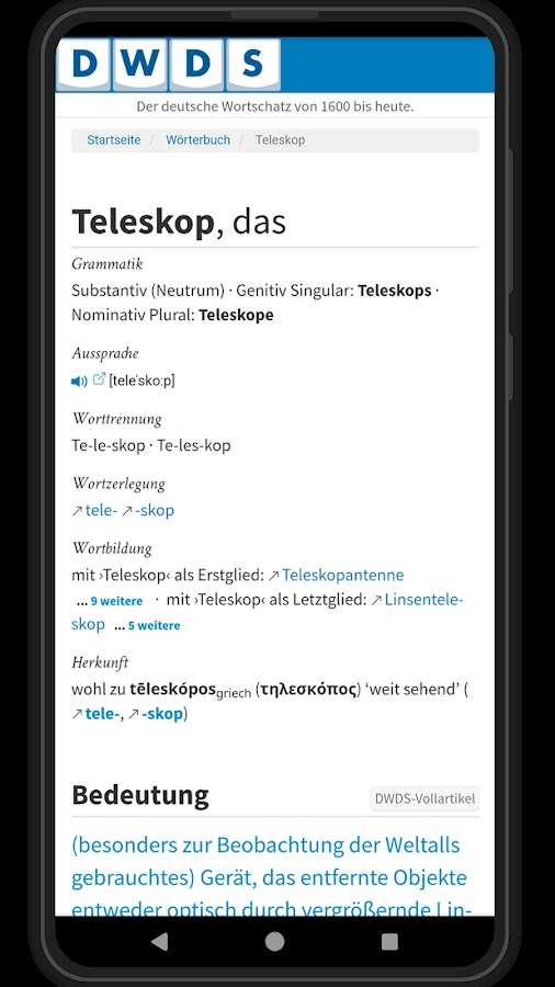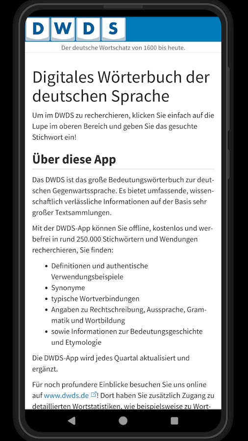Для писателей, учащихся, преподавателей и тех, кто интересуется языками: Цифровой словарь немецкого языка (DWDS) — крупнейший словарь современного немецкого языка. Он предлагает полную и научно достоверную лексическую информацию бесплатно и без рекламы. С помощью приложения вы можете в любое время найти определения, примеры использования, информацию по орфографии, грамматике и этимологии, а также синонимы и типичные словосочетания примерно для 260 000 ключевых слов и фраз в автономном режиме — от A, например «a cappella», до Z, например, «zürnen».