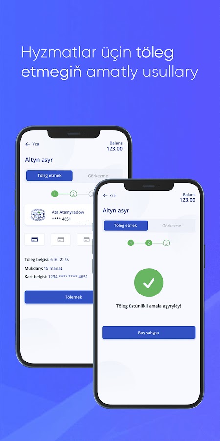 Hyzmatlar üçin tölegleri we hasaby doldyrmak häzirki wagtda «Altyn asyr» we Türkmenistanyň Döwlet daşary ykdysady iş bankynyň «Milli Visa» karty arkaly plastik kartlary arkaly onlaýn ýerine ýetirilip biliner.