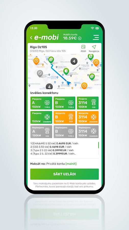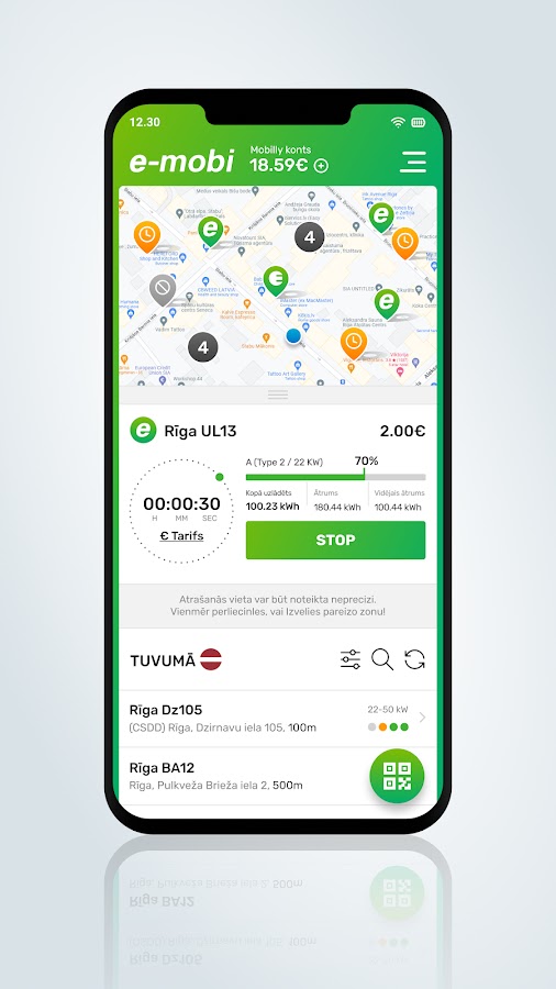 Приложение E-mobi показывает карту общественных точек зарядки в Латвии и позволяет проверить их доступность, скорость зарядки и цены. Заряжайте свой электромобиль через смартфон (запускайте и останавливайте сеанс зарядки).