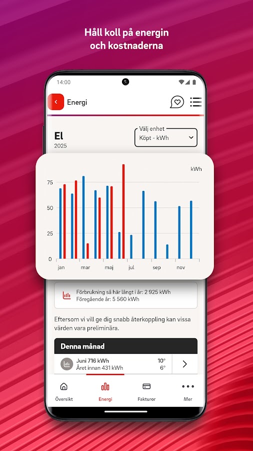 Отслеживайте потребление энергии и сравнивайте его с предыдущими месяцами и годами. С помощью данных о температуре от SMHI вы можете увидеть, как погода влияет на потребление и расходы. Вы производите собственную электроэнергию, например, с помощью солнечных батарей? Затем вы также увидите, сколько энергии вы покупаете и продаете каждый месяц.